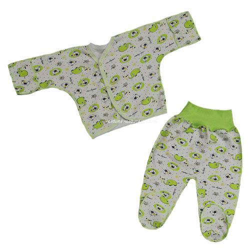 Комплект состоит из распашонки с ассиметричной застёжкой на кнопочках спереди, с рукавчиками-трансформерами и ползунков на еврорезинке.