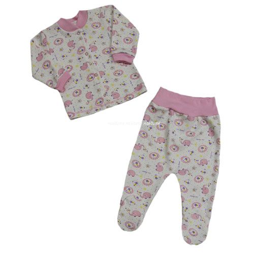 Комплект состоит из кофточки с длинным рукавом, с воротничком, спереди на кнопочках и ползунков на широкой резинке.